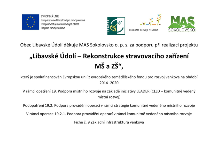 Obec Libavské Údolí děkuje MAS Sokolovsko o.p.s. za podporu při realizace projektu "Libavské Údolí - Rekonstrukce stravovacího zařízení MŠ a ZŠ", který je spolufinancován Evropskou unií z evropského zemědělského fondu pro rozvoj venkova na období 2014 - 2020.